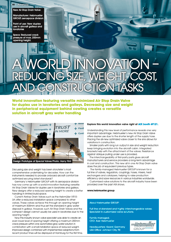Germany ́s Hebmueller GROUP with its aerospace division has now come up with a world innovation featuring versatile Air Stop Drain Valves for duplex use in lavatories and galleys. New designs offer a reduced opening height to create a better handling in limited build space.